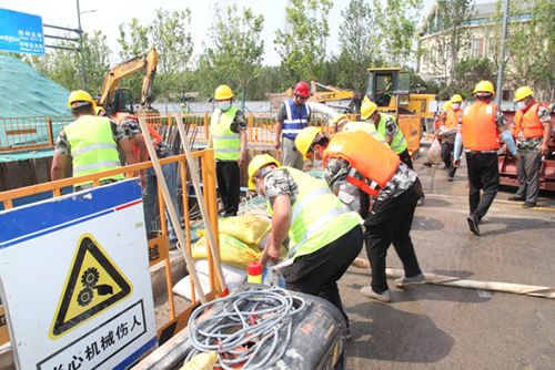 本次演練以因強降雨造成滹沱河和太平河洪水爆發(fā),即將對項目部造成威脅為背景,模擬項目部員工發(fā)現(xiàn)險情后,立刻向項目部防汛值班領(lǐng)導(dǎo)報告,值班領(lǐng)導(dǎo)向指揮長進行報告,指揮長下令立刻啟動應(yīng)急預(yù)案,各應(yīng)急小組迅速進入應(yīng)急備戰(zhàn)狀態(tài),配備防汛機具,迅速奔赴現(xiàn)場搶險,設(shè)置警示標(biāo)志和安全警戒區(qū)域,組織人員疏散,搶救重要物資,加固土坡,裝運沙袋,同時組織修復(fù)道路,恢復(fù)交通,保證撤離路線暢通,進行搶險救援全過程。